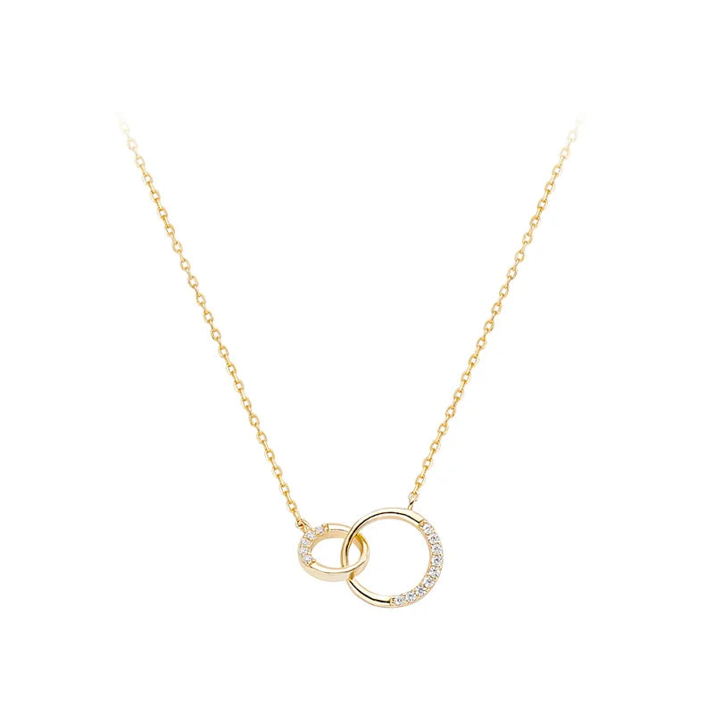 Crafted from the finest 925 sterling silver and delicately gold plated, this necklace seamlessly blends sophistication with a hint of sparkle. The design features two interlocking rings symbolizing unbreakable bonds, adorned with tiny stones for subtle brilliance. The fine chain completes the necklace, keeping the focus on the intertwined rings.